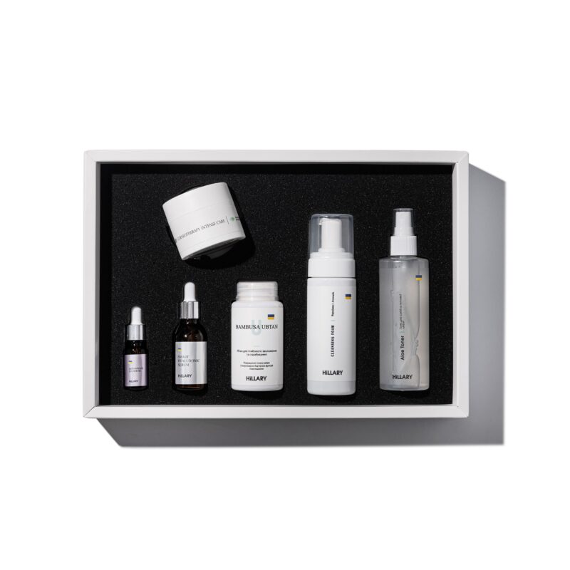 Ексклюзивний комплекс для шкіри зрілого типу обличчя з продуктами антивікового догляду. Експертний комплекс Anti-Aging включає в себе всі необхідні засоби для базового антивікового догляду, а також компоненти, що ефективно борються з наслідками старіння шкіри – появою зморшок, втратою об’єму і пружності. Поєднання всіх компонентів у цьому косметичному наборі уповільнюють старіння клітин, а антиоксиданти, вітамін С, гіалуронова кислота та серія рослинних олій допомагають шкірі швидше оновлюватися та регенеруватись. До набору входять: Зволожуючий гель для вмивання з вітаміном С Hillary Vitamin С Мoisturizing Cleansing Gel, 150 мл; Трояндовий міст для обличчя Hillary ROSE MIST, 120 мл; Гіалуронова зволожуюча сироватка Hillary Pure Hyaluronic, 30 мл; Експрес сироватка навколо очей Hillary Express Eye Serum, 10 г; Крем для всіх типів шкіри Hillary Corneotherapy Intense Сare 5 oil’s, 50 мл. Спосіб за стосування: Спіньте гель в долонях і нанесіть на шкіру масажними рухами. Змийте великою кількістю води. При потраплянні в очі, негайно промийте їх водою. Нанесіть міст на очищену шкіру обличчя перед доглядовими засобами (а також можна наносити поверх макіяжу для його закріплення.) Нанесіть масажними рухами невелику кількість сироватки Pure на чисту шкіру обличчя, шию і зону декольте. Невелику кількість сироватки Express нанесіть кінчиками пальців на добре очищену шкіру навколо очей. Невелику кількість крему нанесіть масажними рухами на шкіру обличчя.