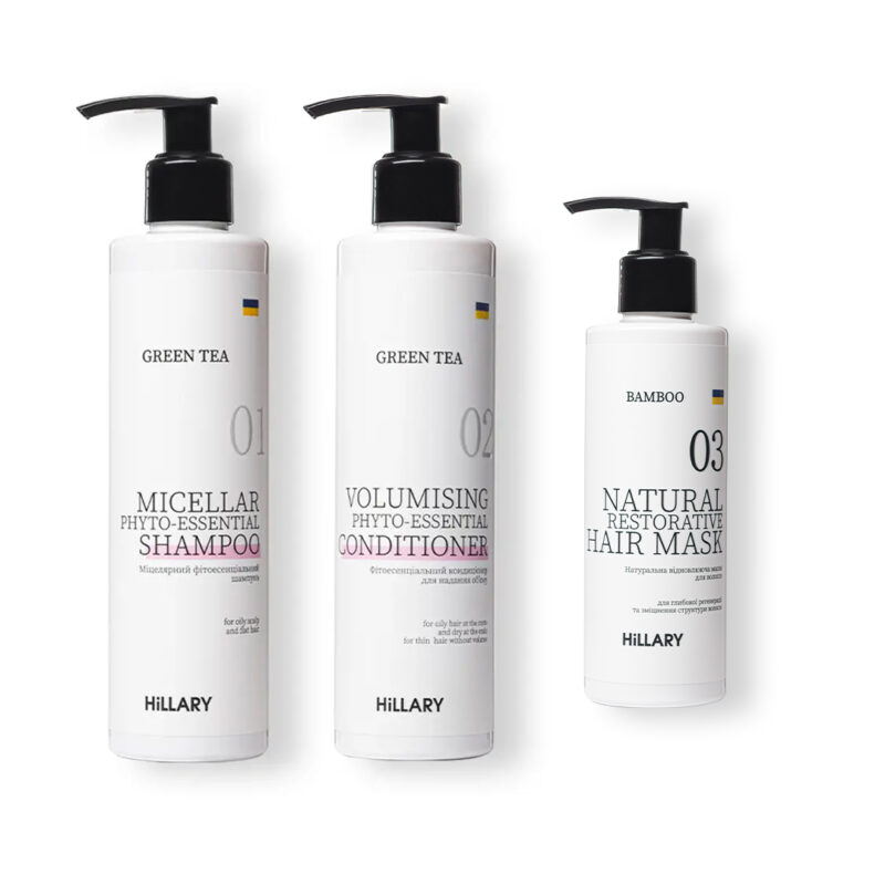 Шампунь спеціально розроблений для шкіри голови із надмірною секрецією шкірного сала па позбавленого об’єму волосся. Очищає та регулює жирність шкіри, протидіє ефекту жирного волосся. Завдяки вмісту органічного екстракту зеленого чаю стимулює волосяні цибулини та живить їх, має антибактеріальну дію, усуває жирність волосся і дарує йому неймовірний блиск та довготривалий об’єм. Інноваційна формула кондиціонеру, яка створює об’єм, зміцнюючи тонке та позбавлене об’єму волосся, одночасно розплутуючи, надаючи блиску та зволоження. Сприяє оздоровленню волосся, потовщує діаметр стрижня та створює об’єм, одночасно доглядаючи за сухими кінчиками. Маска для волосся BAMBOO Hair Mask прекрасно відновлює волосся від коренів до самих кінчиків, зміцнює їх структуру, надаючи їм пружність, еластичність і здоровий вигляд. Підходить для всіх типів волосся. До набору входять: Міцелярний фітоесенціальний шампунь Green Tea Hillary Green Tea Micellar Phyto-essential Shampoo, 500 мл Фітоесенціальний кондиціонер для надання об’єму Green Tea Hillary Green Tea Volumising Phyto-essential Conditioner, 500 мл Натуральна маска для відновлення волосся Hillary BAMBOO Hair Mask, 200 мл Спосіб застосування: 1. Нанесіть шампунь масажними рухами на вологе волосся, спіньте, залиште на 1-2 хвилини, потім ретельно змийте теплою водою. Повторіть двічі. Підходить для щоденного застосування. Увага! Уникати контакту з очима. У разі потрапляння в очі негайно промити їх водою. 2. Рівномірно розподіліть кондиціонер на чисте волосся після миття шампунем і залиште на 5-10 хвилин. Змити теплою водою. 3. Нанестіть маску на вологе волосся після миття, потримайте 5-10 хвилин і змийте теплою проточною водою.