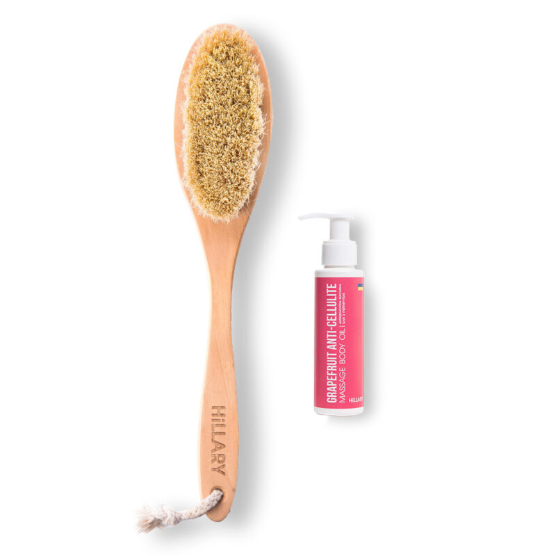 Щітка для сухого масажу сизалева Hillary + Антицелюлітна олія Грейпфрут Hillary Grapefruit Anti Cellulite, 100 мл