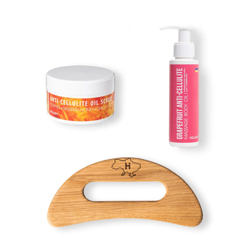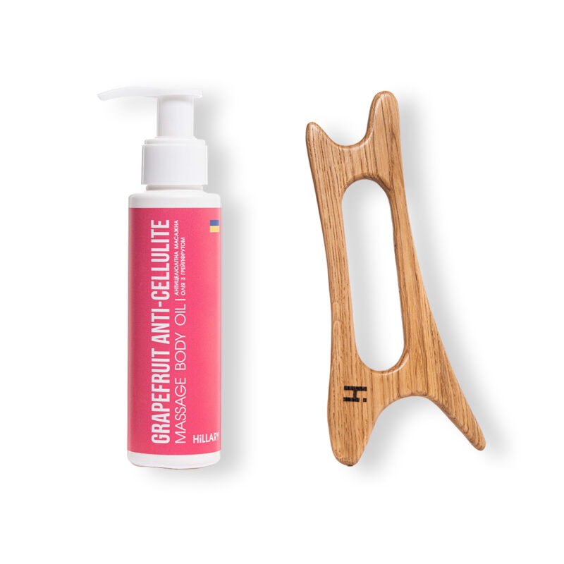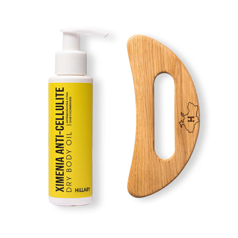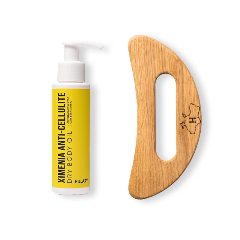 Шкребок гуаша для тіла дерев‘яний + Антицелюлітна суха олія з ксименією 250 мл