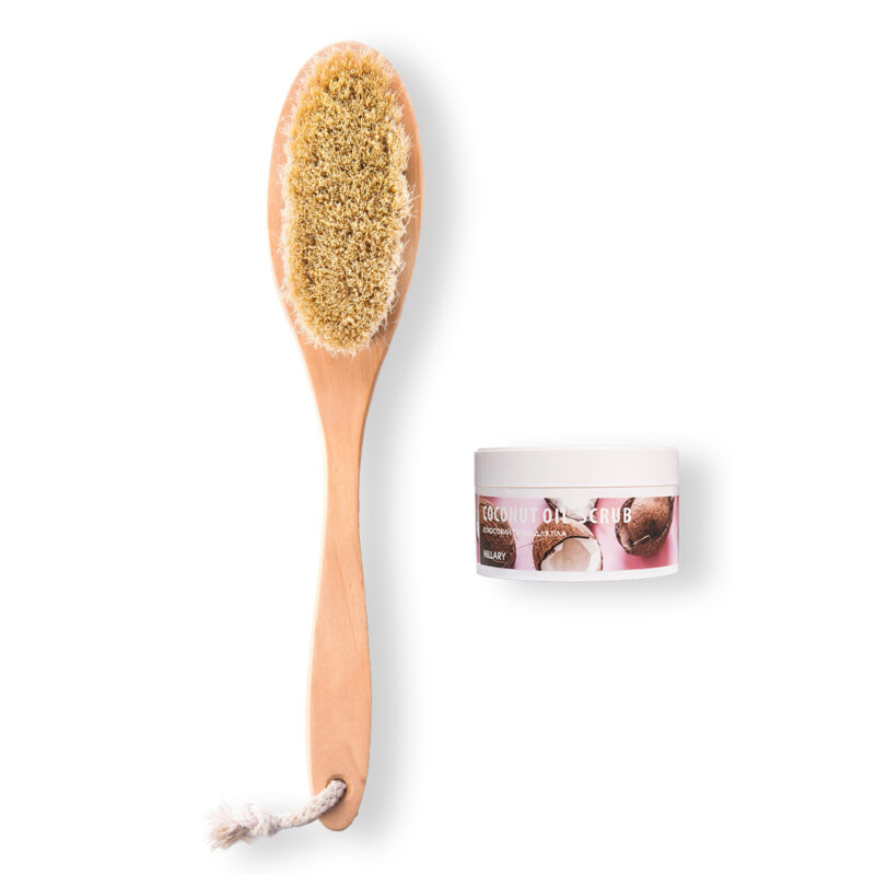 Щітка для сухого масажу сизалева Hillary + Скраб для тіла кокосовий Hillary Coconut Oil Scrub, 200 г