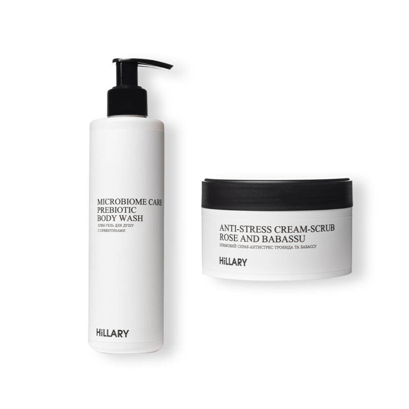 Ніжна формула гелю на основі суміші інноваційних натуральних ПАР Genagen 3SB та GlucoTain liquiFlex м’яко та ретельно очищає поверхню шкіри від забруднень, не ушкоджуючи природну гідроліпідну плівку. Вміст натуральних екстрактів алое та ромашки допомагає підтримувати оптимальний рівень зволоженості шкіри, робить її пружною та гладенькою. Розкішний крем для рук та нігтів інтенсивно зволожує, живить та захищає шкіру рук від негативного впливу зовнішніх агресивних чинників. Біоміметичні зволожувачі SACCHARIDE ISOMERATE (AND) INOSITOL та поліпептиди веганського шовку SR-SPIDER POLYPEPTIDE-1 сприяють зволоженню не тільки шкіри рук, але й сухої кутикули, що профілактують ламкість нігтів та появу задирок. До набору входять: Крем-гель для душу з пребіотиками Hillary Microbiome Care Prebiotic Body Wash, 250 мл Крем для рук та нігтів з поліпептидами шовку Hillary Hand and Nail Silk Cream, 30 мл Спосіб застосування: Невелику кількість гелю нанести на вологу шкіру за допомогою губки або рук, після 1-2 хвилинного масажу ретельно змити водою. Підходить для щоденного використання. Невелику кількість крему нанести на чисту злегка вологу шкіру. Застосовувати протягом дня за потреби.