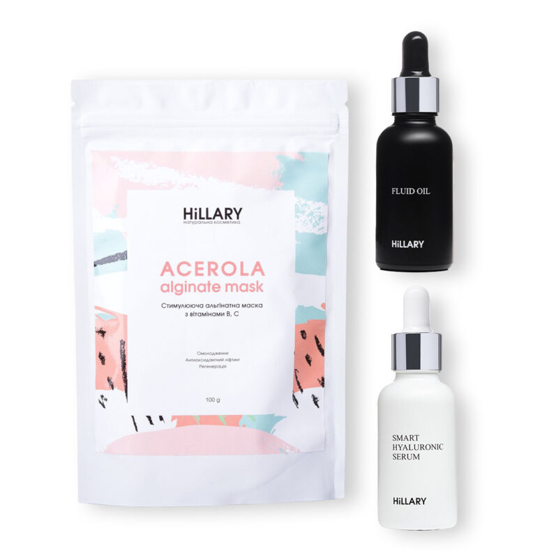 Набір для шкіри обличчя, схильної до сухості, допоможе потурбуватись про чутливу шкіру завдяки спеціально підібраним продуктам. Альгінатна зволожуюча маска Moisturizing підтягує шкіру, робить більш чітким овал обличчя, відбілює пігментні плями, веснянки і сліди постакне а також стимулює синтез колагену. Олійний флюїд для обличчя звужує пори і робить зморшки менш помітними. Так досягається ефект гладенької шкіри і рівного тону, тому макіяж лягає ідеально і довше виглядає свіжим. Дає потужний захист від сонця і вільних радикалів. Убтан ASAI в 3 рази зменшує кількість чорних точок, відлущені ороговілі клітини, шкіра має сяючий вигляд. Відбувається очищення шкіри від токсинів і наповнення її корисними вітамінами і мінералами. Робить шкіру еластичнішою, приховує вікові зміни шкіри, глибоко очищає пори, прибирає запальний процес, зволожує. Гіалуронова сироватка створена для цілеспрямованого відновлення шкіри. Технологія відновлення з додатковим інтенсивним зволоженням допомагає шкірі вбирати і утримувати вологу там, де це необхідно. Шкіра миттєво стає більш зволоженою і захищеною. Лавандовий міст має приємний розслаблюючий аромат, матує шкіру. Заміна тонікам і термальній воді, знімає подразнення, має антибактеріальну дію, звужує пори, вирівнює тон шкіри. Повсякденний базовий догляд, який не потребує особливих зусиль. Після використання шкіра стає ніжною і шовковистою. До набору входять: Альгінатна зволожуюча маска Hillary Moisturizing Alginate Mask, 100 г; Олійний флюїд для обличчя Hillary FLUID OIL, 30 мл; Убтан для м’якого очищення і скрабування Hillary ASAI UBTAN, 100 г; Гіалуронова сироватка Hillary Smart Hyaluronic, 30 г; Лавандовий міст для обличчя Hillary LAVENDER MIST, 150 мл Спосіб застосування: Невелику кількість убтану розвести з водою до пастоподібного стану ат нанести на зволожене обличчя масажними рухами. Змити проточною водою або за допомогою муслінової серветки. Можна застосовувати двічі на день. Наносити тонік на очищену шкіру обличчя вранці і ввечері перед сном. Може використовуватися в якості тоніка перед доглядовими засобами, а також наноситися поверх макіяжу для його закріплення. Промокніть очищене обличчя м’яким рушником і нанесіть трохи сироватки. Так молекули гіалурону отримають достатню кількість вологи для роботи в верхніх шарах шкіри. Для більш вираженого ефекту, збагатіть сироватку олійним флюїдом. Змішайте в долоні дві краплі олії з двома краплями сироватки і нанесіть масажними рухами на чисту, вологу шкіру обличчя, шию і зону декольте. Використовуйте щодня, вранці (в тому числі і як активний засіб під денний крем) і ввечері. Якщо надворі температура повітря нижче 0, після нанесення сироватки рекомендуємо перед виходом почекати 30 хвилин до повного вбирання. Підготуйте альгінатну маску безпосередньо перед застосуванням. Візьміть будь-яку суху неметалічну ємність, змішайте в ній вміст з водою кімнатної температури в пропорції 1: 1. Важливо! Ретельно перемішуйте все збиваючим рухом до однорідної маси, поки не отримаєте консистенцію густого і тягучого крему. Маску наносьте на шкіру щільним рівномірним шаром близько 0.5 см. за допомогою шпателя. Протягом наступних 10-15 хвилин засіб стає схожим на гуму і трохи зменшується в об’ємі. Альгінатна маска не потребує змивання водою. Через 15-20 хвилин вона легко знімається у вигляді м’якого пластичного зліпка, що повтор