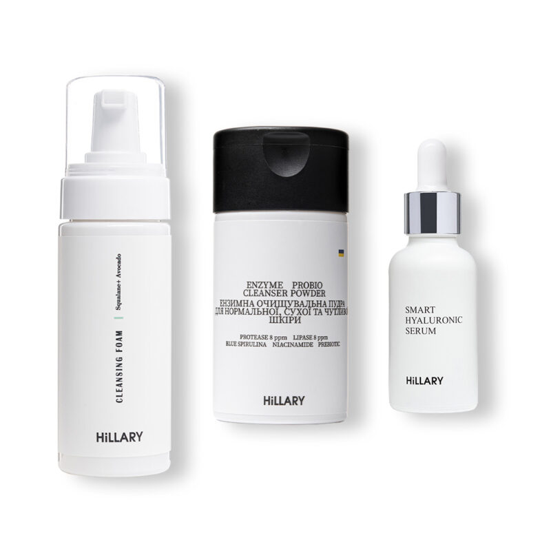 Набір Ензимне очищення та зволоження для сухої та нормальної шкіри для ніжного та водночас ретельного очищення шкіри та підготовки її до подальшого догляду. Ензимна пудра якісно та глибоко очищає шкіру від забруднень, видаляє відмерлі клітини завдяки дії 2 типів ензимів рослинного походження – PROTEASE та LIPASE. Містить органічний пребіотик для балансу мікробіому шкіри та ніацинамід для відновлення та зволоження. Гіалуронова сироватка зволожує глибокі шари шкіри, попереджає старіння і відроджує молодість шкіри, відновлює і захищає, утримує вологу всередині шкіри, помітно скорочує зморшки, підтягує шкіру і надає їй сяйва. Під час масажу, властивості гіалуронової сироватки значно підсилюються. Трояндовий міст для обличчя Hillary ROSE MIST освіжає, живить і зволожує шкіру обличчя. При розпиленні міст огортає обличчя ніжним серпанком, роблячи її ніжною, оксамитовою та насиченою. Має дуже легку формулу, посилює дію інших косметичних засобів, сприяє природному відновленню шкіри. Спрей-міст швидко освіжає шкіру, тонізує, знімає почуття втоми, а також закріплює макіяж. Підходить для нормальної, сухої та чутливої шкіри. До набору входять: Ензимна очищувальна пудра для нормальної, сухої та чутливої шкіри Hillary Enzyme Probio Cleanser Powder, 40 г Гіалуронова сироватка Hillary Smart Hyaluronic, 30 мл Трояндовий міст для обличчя Hillary ROSE MIST, 120 мл Спосіб застосування: Після очищення шкіри нанесіть половину чайної ложки пудри на вологі руки та розітріть до утворення кремової пінки. Нанесіть на обличчя круговими рухами, уникаючи зони навколо очей. Злегка помасажуйте 1-2 хвилини, потім ретельно змийте теплою водою. Використовуйте пудру 1-2 рази на тиждень. Рівномірно нанесіть масажними рухами невелику кількість сироватки Smart на чисту, вологу шкіру обличчя, шию і зону декольте. Міст для обличчя можна використовувати в якості тоніка перед доглядовими засобами, а також наноситися поверх макіяжу для його закріплення.