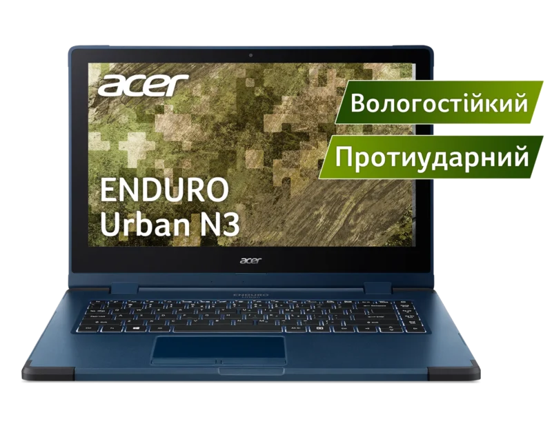 Acer ENDURO Urban N3 Завдяки надійним характеристикам, яскравому екрану і тривалій автономній роботі цей тонкий і міцний ноутбук завжди готовий вирушити з вами в нові пригоди по всьому світу. Acer ENDURO Urban N3 поєднує високотехнологічні характеристики з повсякденним стилем, які дозволять вам комфортно працювати на природі. Створений для пригод Цей тонкий і міцний ноутбук вагою всього 1,85 кг і товщиною 21,95 мм можна брати з собою куди завгодно. Він стане ідеальним супутником у всіх ваших пригоди. Функціональна стійкість В дорозі, вдома або де-небудь ще – цей міцний ноутбук оснащений надійним захистом по чотирьох кутах і пройшов випробування на відповідність вимогам військового стандарту (MIL-STD 810H), щоб витримувати практично будь-які умови експлуатації. Опір рідини Водонепроникна конструкція портів введення-виведення, динаміків і кнопок дозволяє брати ноутбук з собою куди завгодно, не турбуючись про погоду. Крім того, на додаток до водонепроникного вентилятора і унікальної дренажної системи сертифікація IP53 гарантує, що він захищений від пилу і води. Висока продуктивність Цей ноутбук оснащений процесором Intel Core i3 11-го покоління, відеокартою Intel UHD Graphics, твердотілим накопичувачем місткістю до 512 Гб, пам'яттю DDR4 ємністю до 16 Гб і акумулятором для роботи в автономному режимі до 13 годин,* щоб впоратися з усіма завданнями, з якими ви стикаєтеся поза приміщеннями. Більш яскравий дисплей для роботи поза приміщеннями 14-дюймовий дисплей з роздільною здатністю FHD (1920 x 1080) має яскравість 450 ніт, тому ви можете насолоджуватися більш яскравим і чітким зображенням при використанні ноутбука на поза приміщеннями.* Необмежені можливості підключення Завдяки повнофункціональному порту USB Type-C, технологіям Thunderbolt 4 і Wi-Fi 6 ви завжди будете на зв'язку і готові до нових подорожей. *Технічні характеристики залежать від конкретної моделі. **Всі зображення наведені в якості ілюстрації продукту. Фактичний вид і дизайн можуть відрізнятися в залежності від характеристик конкретної моделі.