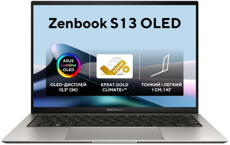 Найтонший у світі ультрапортативний ноутбук з OLED-екраном Полегшіть своє життя з ультратонким і надзвичайно легким Zenbook S 13 OLED! Цей дивовижний ноутбук завтовшки 1 см важить лише 1 кг. Він оснащений енергоефективним процесором Intel® Core™ 13-го покоління, а також чудовим 13,3-дюймовим OLED-дисплеєм із тонкою рамкою (NanoEdge), співвідношенням сторін 16:10, роздільною здатністю 2,8K та підтримкою технології HDR. ASUS повністю віддана інноваціям, які роблять планету кращою, тому ми також зробили Zenbook S 13 OLED найбільш екологічним Zenbook за всю історію, відповідно до наших цінностей. Елегантні кольори. Модний силует Ноутбук представлений у двох чудових кольорах: абсолютно новому базальтовому сірому (Basalt Gray) та класичному синьому (Ponder Blue). Базальтовий відтінок натхненний природною красою гірських пейзажів. Задумливий синій – темніша колірна гама, навіяна тихими ночами. Мінімалістський стиль є важливою частиною мови дизайну Zenbook з її чистими лініями й струнким силуетом, які привертають увагу. Цей ультрапортативний пристрій у повній мірі відображає філософію сучасного мінімалізму в дизайні. Екологічний процес Саме компанія ASUS першою серед виробників ноутбуків впровадила технологічний процес керамізації плазмою, за допомогою якого на алюмінієву кришку пристрою наноситься оригінальне покриття. У цьому процесі використовується чиста вода, і він не потребує органічних сполук, агресивних кислот і важких металів. Цей екологічний метод призводить до фізико-хімічних перетворень в алюмінії під час занурення деталі у спеціальну ванну. Результатом є покращені зносостійкість, корозійний захист, тепловіддача, твердість і довговічність покриття. Більше потужності, менше обмежень Zenbook S 13 OLED оснащено процесором Intel® Core™ i7 13-го покоління, який забезпечує продуктивність для вирішення будь-яких завдань. Цей ноутбук також відповідає вимогам сертифікації Intel® Evo™, тож відзначається миттєвим пробудженням, швидким з’єднанням Wi-Fi і високою енергоефективністю, щоб забезпечити продуктивність протягом усього дня. Більше кольорів, менше правил Приголомшливий OLED-дисплей 2,8K HDR NanoEdge ноутбука Zenbook S 13 OLED відтворює контент деталізованим і сповненим живими кольорами. Портативний OLED-кінотеатр Ноутбуки ASUS оснащуються OLED-дисплеями, перевагою яких є чудова передача кольорів. Вони передають реалістичні відтінки і тому добре підходять для професійної творчої роботи з будь-якими графічними матеріалами. Крім того, завдяки особливим органічним матеріалам, які застосовуються при виробництві OLED-дисплеїв, вони випромінюють на 70% менше шкідливого синього світла, ніж РК-дисплеї, що робить їх більш комфортними для очей. Налаштування кольору для будь-яких потреб з ASUS Splendid Інтегрована програма ASUS Splendid дозволяє швидко та легко перемикатися між колірними гамами, що краще пасують до різних програм чи вподобань. Вибирайте між насиченими оригінальними кольорами, sRGB для перегляду сайтів, DCI-P3 для фільмів та Display-P3 для неймовірно реалістичних кольорів. Пориньте в цифрові розваги Пориньте в атмосферу улюблених розваг із неймовірно реалістичним звуком, який розгортається навколо вас. Стереосистема Zenbook S 13 OLED, що пройшла сертифікацію Harman Kardon, підтримує технологію Dolby Atmos®, а також містить інтелектуальний підсилювач, здатний робити звук у 3,5 рази гучнішим, ніж звичайний підсилювач. Більше портів, мен