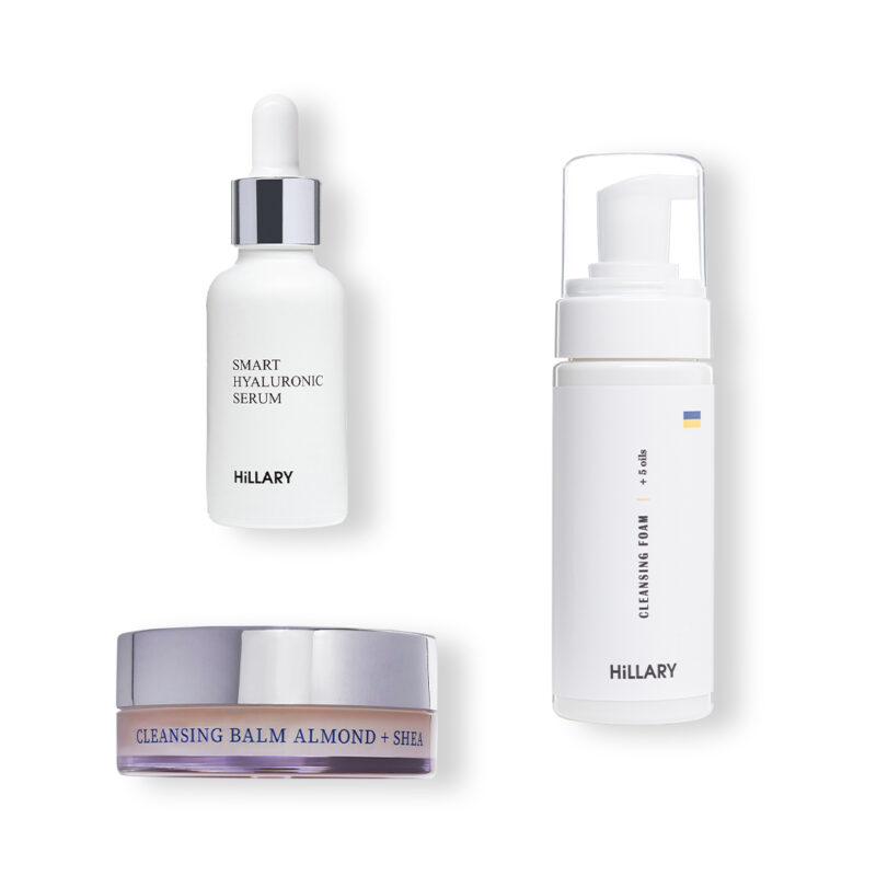 Набір для очищення та зволоження обличчя ефективно знімає макіяж та доглядає за шкірою, усуває постакне та гіперпігментацію та сприяє вирівнюванню тону шкіри за рахунок вироблення колагену. Бальзам на основі мигдальної олії та ефірів ши має консистенцію, що нагадує чисту олію ши та легко тане на сухій шкірі обличчя, очей і губ. Розчиняє залишки декоративної косметики та очищує пори від надлишків шкірного себуму. При контакті з водою перетворюється на ніжне молочко. Легко змивається, не залишаючи жирної плівки. Тонік миттєво зволожує, освіжає шкіру та наповнює її сяйвом. Допомагає активним компонентам доглядових косметичних засобів легко проникати в глибокі шари шкіри. Гель для м’якого очищення повністю позбавляє шкіру обличчя від косметики та забруднень, а також стежить за здоров’ям клітин епідермісу. Усуває сухість та лущення на шкірі, залишаючи відчуття шовковистості та гладкості. Має легкий освітлюючий ефект та антиоксидантну дію завдяки вмісту стабілізованого вітаміну С. До набору входять: Очищувальний бальзам для зняття макіяжу для всіх типів шкіри Hillary Cleansing Balm Almond + Shea, 90 мл Зволожуючий гель для умивання з вітаміном С Hillary Vitamin С Мoisturizing Cleansing Gel, 150 мл Стимулюючий тонік з вітаміном С Hillary Vitamin C Stimulating Toner, 200 мл Спосіб застосування: Нанесіть очищувальний бальзам пальцями на сухе обличчя, зокрема губи й очі. Злегка помасажуйте, потім додайте трохи води й знову м’яко помасажуйте, щоб олія перетворилася на молочну емульсію. Ретельно змийте водою. Спіньте гель в долонях і нанести на шкіру масажними рухами. Змити великою кількістю води. При потраплянні в очі, негайно промити їх водою. Просочіть косметичний диск тоніком і протріть шкіру обличчя, шиї та зони декольте. Може використовуватися вранці та ввечері після процедури очищення шкіри. Підходить для щоденного використання.