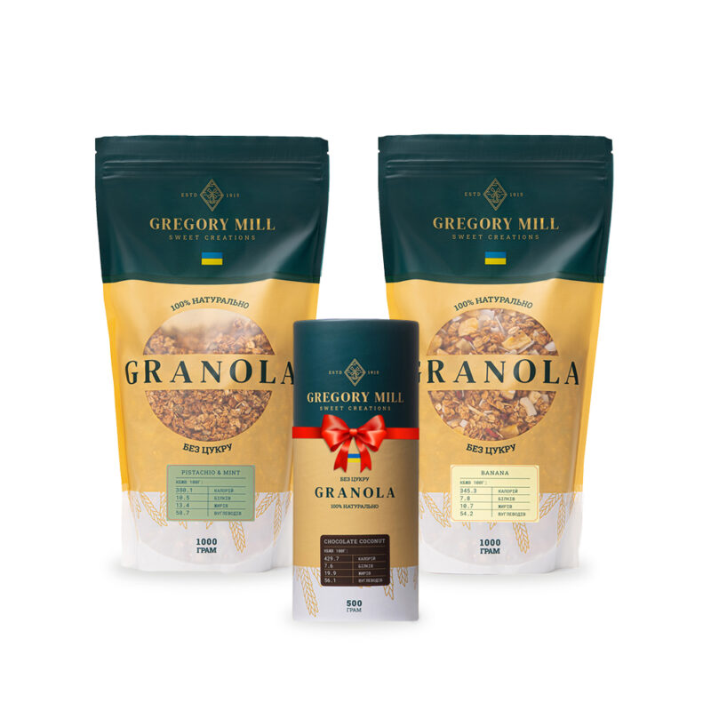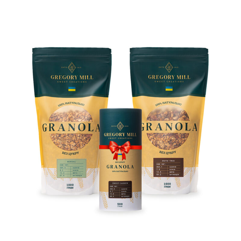 Свята – час затишку, тепла та неймовірних смаків. Даруйте радість та задоволення вашим близьким, обираючи подарунковий набір, який об’єднує у собі неймовірний смак та корисність. Подарунковий набір Gregory Box Nuts Trio + Pistachio&Mint & Chocolate Coconut – ідеальний комплект для створення атмосфери затишку та радості. Набір вражає своєю елегантністю та теплом. Кожна деталь дбайливо продумана, щоб подарунок виглядав особливим та неповторним. Ви не просто даруєте гранолу – ви даруєте частинку затишку та радості. Насичена смаком гранола Gregory Mill CHERRY BOOM! Що може бути кращим, ніж вишневий смак, що поєднався з одними з найцінніших інгредієнтів природи – волоськими горіхами, медом та гарбузовим насінням Це – справжній вибух смаку та поживності. Сушені вишні додають водночас солодкості та кислинки, волоські горіхи – енергії, а гарбузове насіння – користі. Гранола Gregory Mill Finik – вишукане поєднання солодкого фініку з хрустким мигдалем. Фініки здавна символізують життя та плодючість, адже про їх користь відомо з древніх часів. Саме тому ми використовуємо відбірні королівські фініки, щоб збагатити смак граноли цією величчю смаку. Гранола Gregory Mill Nuts’ Trio – Створена для справжніх гурманів, які цінують вишуканість смаку та піклуються про здоров’я. Горіхова гранола містить багато корисних компонентів та одразу 3 види горіхів, які допомагають підтримувати ваше здоров’я у відмінному стані. Смачно та корисно – тепер не мрія, а реальність! До набору входять: Гранола Gregory Mill Cherry Boom, 500 г Гранола Gregory Mill Finik, 500 г Гранола Gregory Mill Nuts’ Trio, 500 г Гранолу можна споживати різними способами: З молоком чи йогуртом. Створюйте смачні сніданки чи перекуси. З фруктами. Додайте соковитість та аромат свіжих фруктів. З медом і грецьким йогуртом. Солодкий та білковий десерт. З сухофруктами. Підкресліть смак граноли родзинками, курагою або іншими сухофруктами за вашим смаком. Як інгредієнт у стравах. Застосовуйте її в смузі, мюслі-барах або випічці для більшої поживності та смаку. Як самостійний продукт. Це неймовірно смачний хрусткий перекус, яким можна замінити шкідливі снеки та смачно «похрумтіти». Продукт є 100% натуральним: без цукру; без пальмової олії; без ГМО; без консервантів. Відкривайте для себе більше смаків та корисних поєднань разом з Gregory Mill! Ознайомтеся з усіма нашими наборами та насолоджуйтесь вишуканістю в кожній порції.
