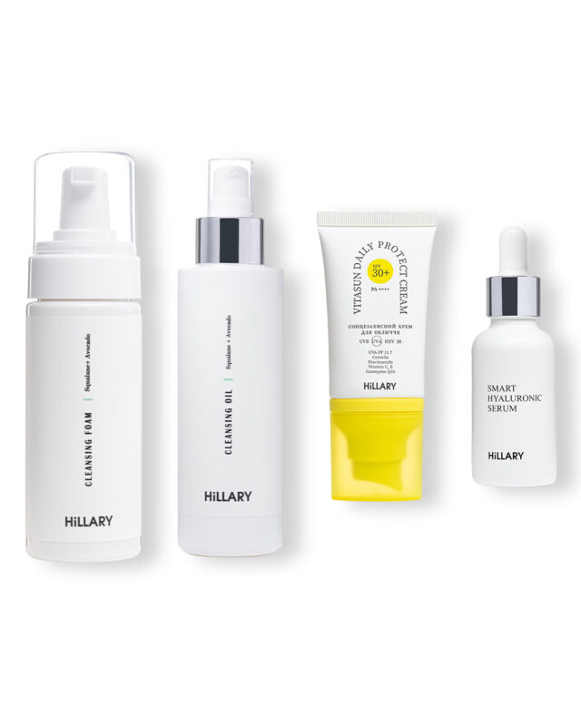 Набір для покрокового догляду протягом дня, в який входять усі необхідні засоби для щоденного догляду за обличчям з сухим типом шкіри. Санскрін для щоденного використання з потужним захистом від UVA, UVB, HEV та IR випромінювання. Мікс фільтрів останнього покоління Uvinul A plus B та Tinosorb М забезпечує потужний захист шкіри від сонця в умовах міста, адже працює при нанесенні у невеликих кількостях та не вимагає поновлення протягом дня та служить чудовою базою для макіяжу. Екстракти паростків соняшнику та насіння дерева тара протидіють негативному впливу на шкіру синього (HEV) та інфрачервоного світла (IR), зберігають структурний колаген для пружності шкіри. Очищуюча пінка для сухої та чутливої шкіри зі скваланом та олією авокадо відновлює ліпідний бар’єр та не шкодить мікробіому шкіри, делікатно та м’яко розчиняє та видаляє навіть найстійкіший макіяж, надає шкірі обличчя приємного відтінку та вирівнює тон. Гідрофільна олія для сухої та чутливої шкіри Hillary Cleansing Oil Squalane + Avocado oil створена на основі інноваційних емульгаторів рослинного походження, чудово підходить для щоденного очищення сухої та чутливої шкіри, відновлює ліпідний бар’єр та не шкодить мікробіому шкіри, делікатно та м’яко розчиняє та видаляє навіть найстійкіший макіяж, добре змивається та чудово підходить для масажу обличчя , надає шкірі обличчя приємного відтінку та вирівнює тон. А гіалуронова сироватка зволожує глибокі шари шкіри, попереджає старіння і відроджує молодість шкіри, відновлює і захищає, утримує вологу всередині шкіри, помітно скорочує зморшки, підтягує шкіру і надає їй сяйва. Під час масажу, властивості гіалуронової сироватки значно підсилюються. До набору входять: Гідрофільна олія для сухої та чутливої шкіри Hillary Cleansing Oil Squalane + Avocado oil, 150 мл; Очищуюча пінка для сухої та чутливої шкіри Hillary Cleansing Foam Squalane + Avocado oil, 150 мл; Гіалуронова сироватка Hillary Smart Hyaluronic, 30 мл; Сонцезахисний крем для обличчя SPF 30+ Hillary VitaSun Daily Protect Cream, 40 мл Спосіб застосування: Невелику кількість гідрофільної олії, попередньо збовтуючи, нанесіть на суху шкіру обличчя. Помасажуйте протягом декількох хвилин, за цей час гідрофільна олія ретельно розчинить жир, косметику і бруд. Змочіть руки водою і повторно помасажувати обличчя, перетворюючи олію в емульсію. Змийте проточною водою; Після очищення шкіри гідрофільною олією, використовуйте для вмивання невелику кількість очищуючої пінки. Нанесіть її на вологе обличчя легкими масажними рухами, ретельно сполосніть обличчя водою; На очищену шкіру нанесіть кілька крапель гіалуронової сироватки масажними рухами нанести на чисту шкіру обличчя, шиї і зоні декольте. Наносити сироватку можна двічі на день, в тому числі як активний засіб під крем. Невелику кількість крему spf нанесіть на шкіру обличчя дуже тонким шаром. Зачекайте 2-3 хв та нанесіть другий тонкий шар. В умовах пляжу чи тривалого передування на активному сонці необхідно оновлювати захист кожні 2 години.