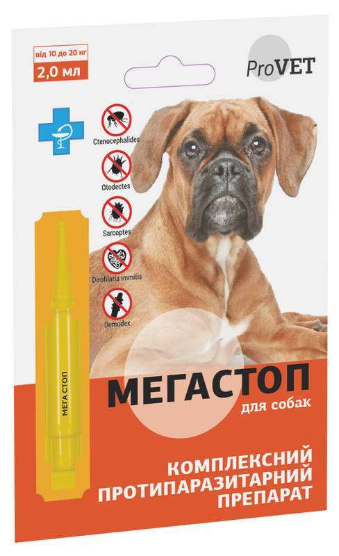Краплі ProVET МЕГА СТОП є препаратом комплексної дії та ефективним для боротьби і профілактики екто- і ендопаразитів у собак. Препарат, випущений в формі крапель, найбільш зручний в застосуванні і не викликає стресу у тварини. У лабораторних умовах доведено ефективність препарату при ураженні собаки:…