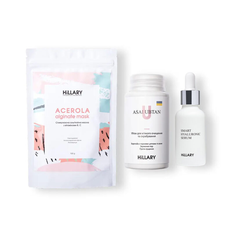 Комплекс для глибокого зволоження та відновлення шкіри обличчя живить та зволожує, забере чорні цятки, відновлює та заспокоює шкіру, знімає почервоніння та подразнення, зменшить запалення, звузить пори та вирівняє тон, поверне еластичність шкірі та надасть здорового вигляду обличчя. До набору входять: Натуральна олія для обличчя та волосся Hillary JOJOBA OIL, 30 мл; Убтан для м’якого очищення і скрабування Hillary ASAI UBTAN, 100 г. Спосіб застосування: Невелику кількість порошку убтану насипте у долоню, додати трохи води і розвести до пастоподібного стану. Нанести на вологу шкіру, обережно розподілити по всьому обличчю, помасажувати і змити. Можна застосовувати двічі-тричі на тиждень. Олію жожоба нанесіть тонким шаром на шкіру обличчя, шиї й декольте і почекати, поки воно повністю вбереться. Така процедура сприяє усунення мішків під очима, зволоженню шкіри. Якщо ваша шкіра не схильна до закупорювання пор, можете наносити олію поверх нічного крему і залишати на обличчі до ранку. УВАГА! Тимчасово можлива поставка убтану в іншій тарі або тарі іншого кольору в зв’язку з перебоями в постачаннях тари через карантинні обмеження. Склад продукту не змінювався